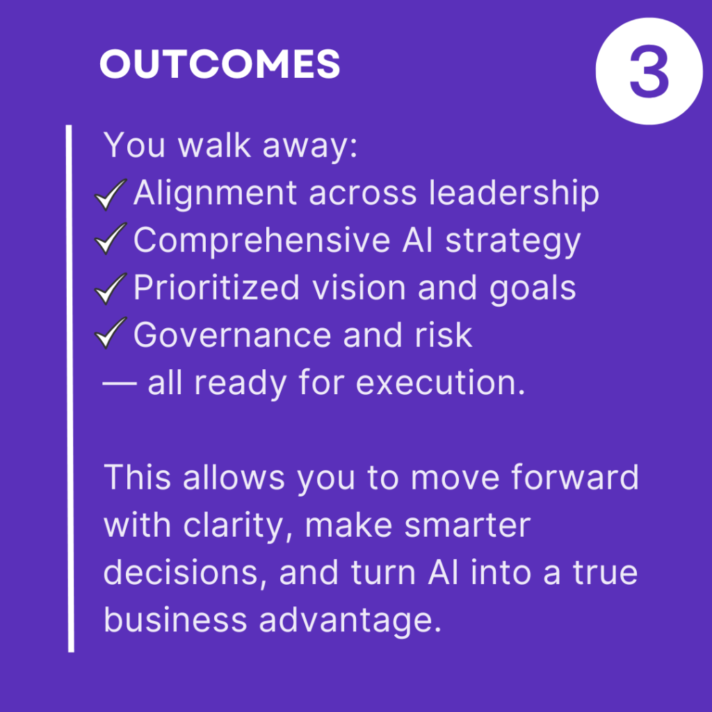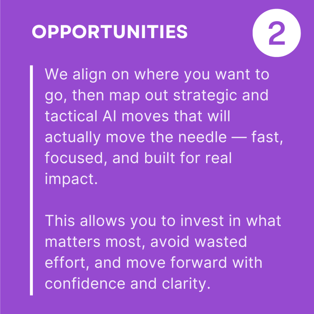 TIMEFRAME: We cut through the AI noise in this 1-month intensive, and build you an AI Strategy that actually works, so you can stop spinning your wheels and and start making smart, strategic moves.