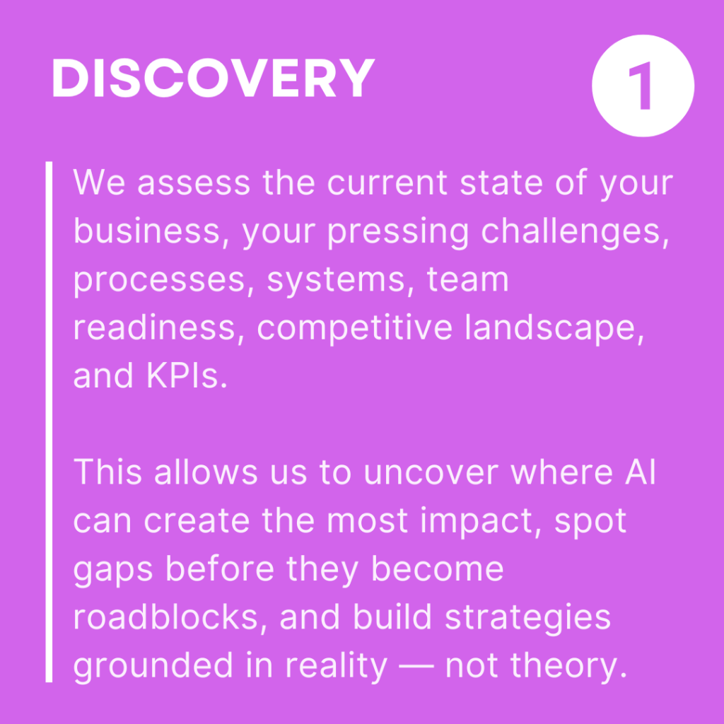 Whether you’re experimenting with AI or already in motion, we help you cut through the noise, focus on what matters, and move fast — with a strategy you can actually use.